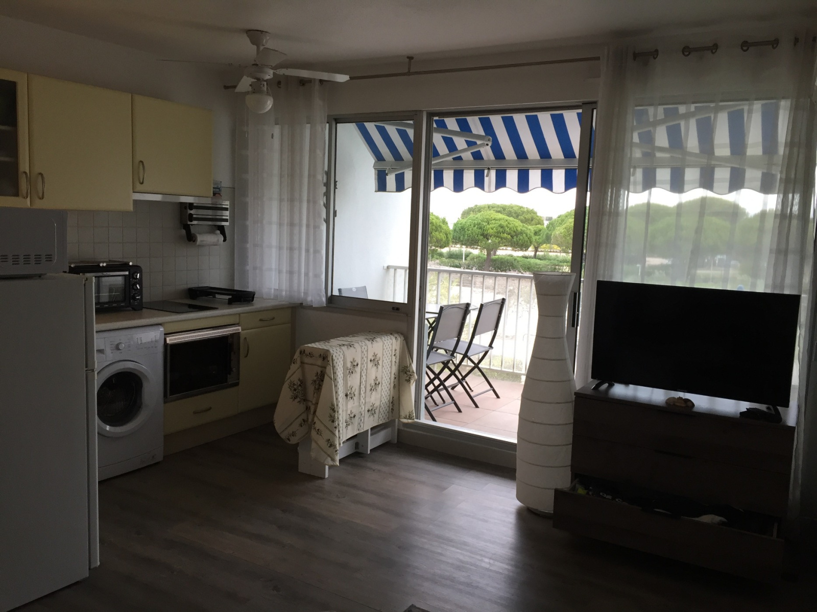- cuisine ouverte avec grand frigidaire-combi, une machine à laver, une planche, micro-onde, four, … tout le nécessaire pour faire à manger et prendre ses repas.
